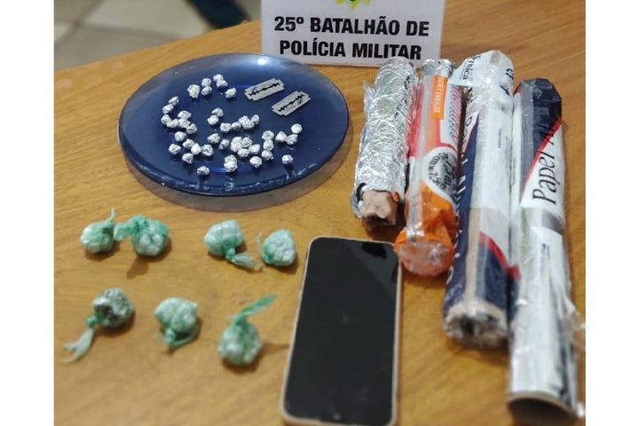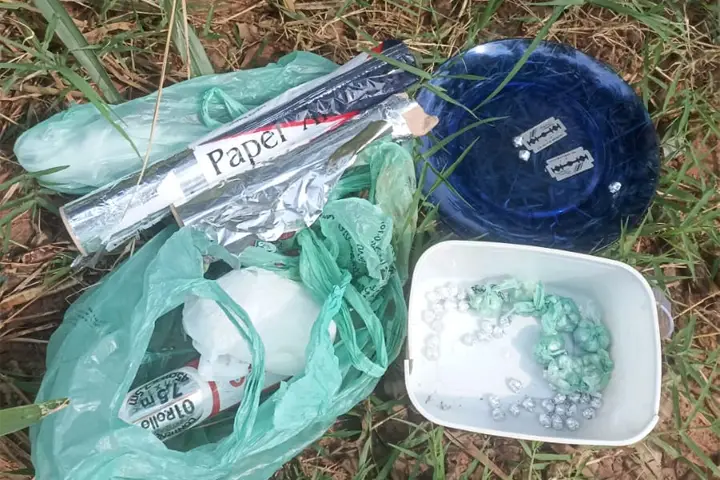 Os policiais foram até o local indicado e encontraram o homem em um terreno baldio. Junto dele foram localizadas 135 pedras de crack, lâminas de corte, um prato e papel alumínio para preparação e fracionamento da droga.