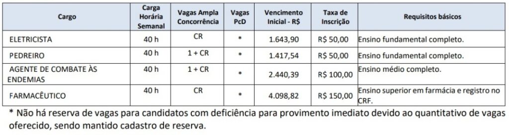 As taxas das inscrições variam de R$ 50 a R$ 150, dependendo do cargo pretendido. Todos os candidatos serão submetidos a prova objetiva, que tem como data provável o dia 16 de outubro – o que ainda será oficialmente confirmado. Aqueles que se inscreverem para as funções de pedreiro e eletricista também serão submetidos à prova prática. E os candidatos ao cargo de farmacêutico terão prova de títulos.