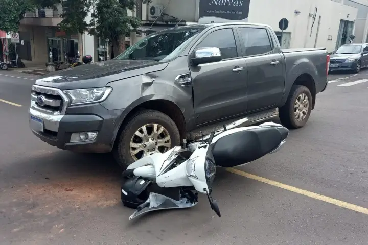 Uma condutora de motoneta Honda Biz, de 20 anos, ficou ferida após uma colisão contra uma caminhonete Ford Ranger no cruzamento das ruas Arapongas com Marialva, na manhã desta quinta-feira (15) no Centro de Umuarama. O acidente deixou o trânsito parcialmente interrompido no quarteirão.