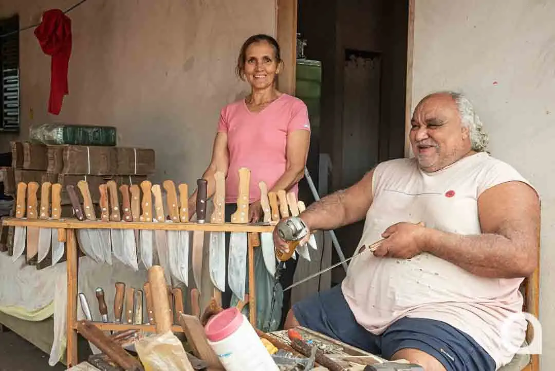 O casal, que é autodidata no ofício, usa pedaços de aço de reciclagem, como disco de trator, e aproveitam lenha do sítio para o aquecimento, antes da forja. “Com a lâmina pronta, em duas horas faço uma faca”, conta Custódio. O produto final é rústico, mas aparentemente forte.