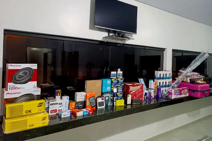 O condutor, de 43 anos, e a passageira, de 36, foram flagrados transportando diversos itens, como material de solda, cigarros, charutos, Vape, diversos tipos acessórios eletrônicos, celulares, remédios de venda proibida no Brasil, bebidas alcoólicas, perfumes, itens domésticos e outros produtos.