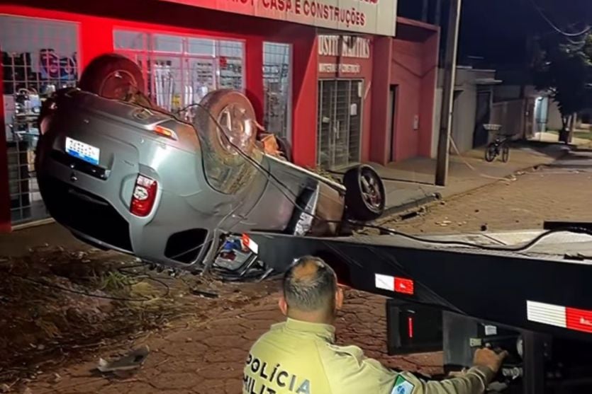 ACIDENTE 24/05/2025 às 09:36 Veículo capota após colisão com poste e deixa duas pessoas feridas em Cruzeiro do Oeste