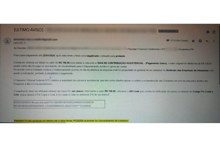 ALERTA DE GOLPE 23/01/2024 às 18:44 Sindilojistas faz alerta sobre golpe envolvendo um fictício Sindicato de Empresas de Umuarama