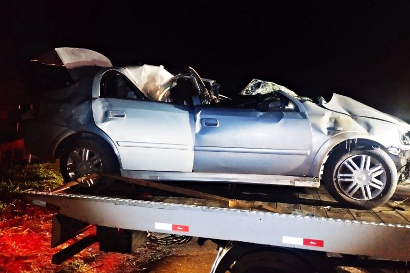 AUTO X MÁQUINA 03/11/2024 às 11:32 Idoso fica ferido após colidir em retroescavadeira e carro capotar na PRC-272, em Iporã