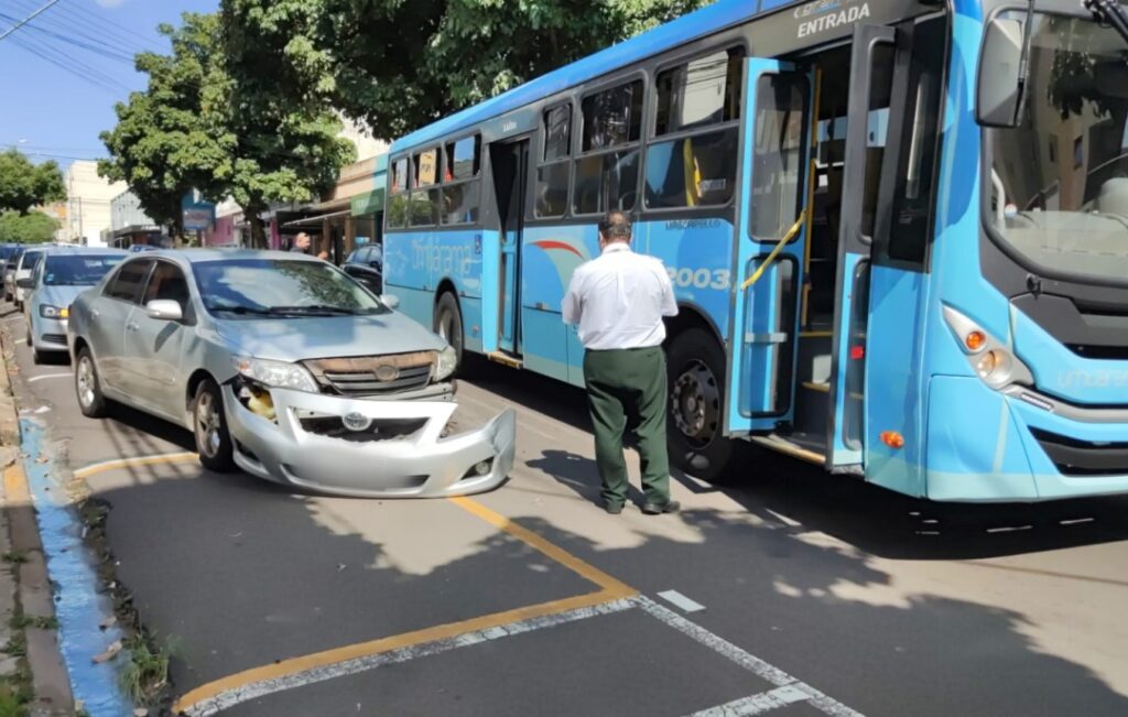 AUTO X ÔNIBUS 09/05/2025 às 15:08 Passageira fica ferida após colisão entre ônibus e carro no centro de Umuarama