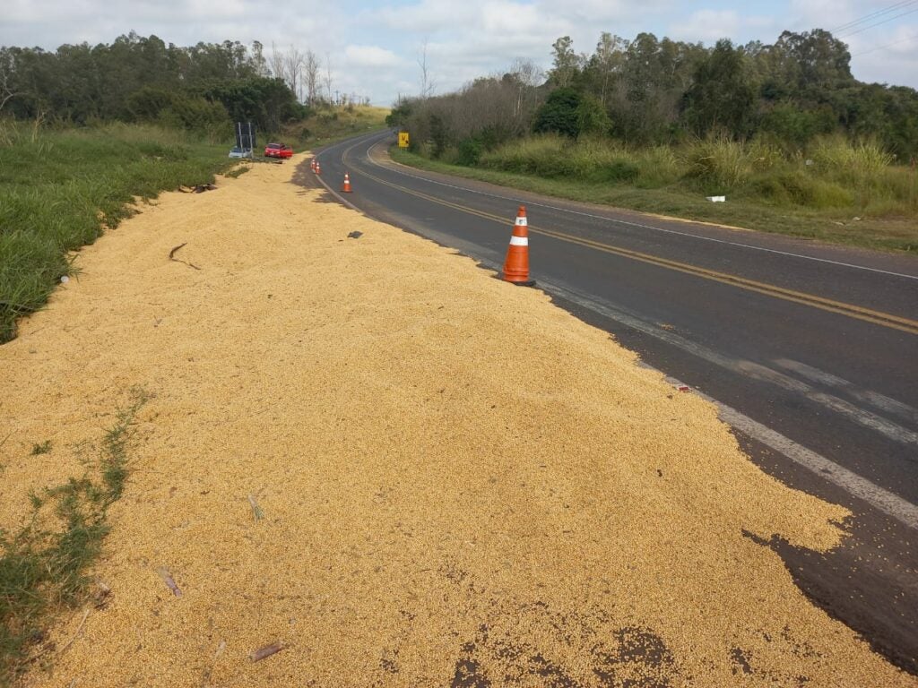 BAIXADA DO TUBÃO 26/06/2022 às 14:03 Carreta carregada com soja tomba na PR-323, a dois quilômetros de Umuarama