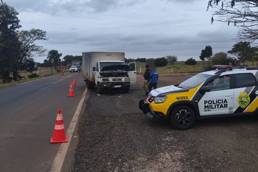 CAMINHÃO X MOTO 26/08/2025 às 08:52 Motociclista fica ferido após colisão traseira em trecho de obras na PR-082