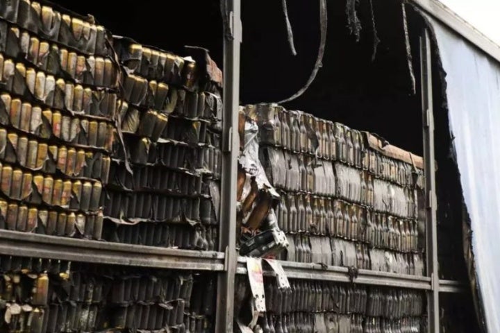 Carga foi atingida 22/01/2024 às 18:36 Pneu estoura e provoca incêndio em caminhão de cerveja na BR-163