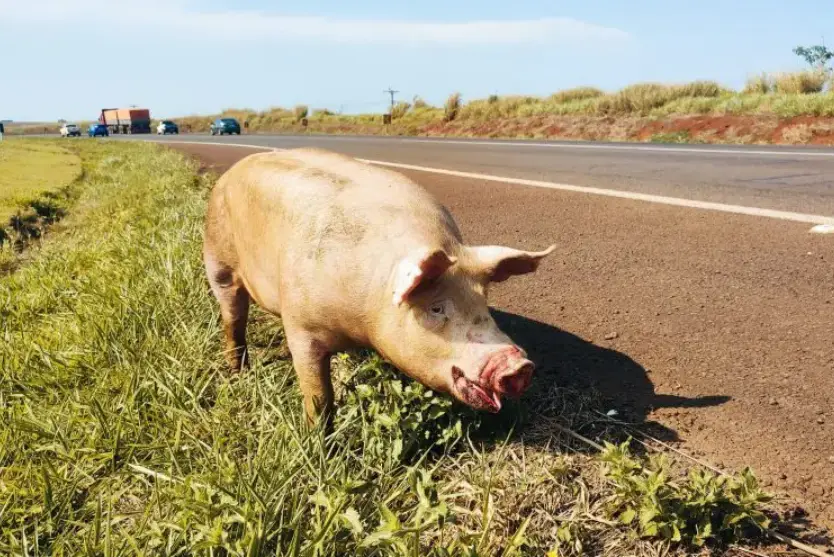 CASCAVEL 29/10/2024 às 21:41 Porco que provavelmente caiu de caminhão é encontrado perambulando na BR-163