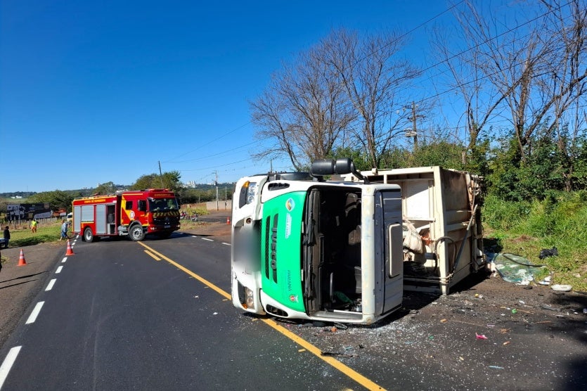 CIANORTE 29/07/2025 às 15:02 Tombamento de caminhão de coleta de lixo na PR-082 deixa 3 trabalhadores feridos