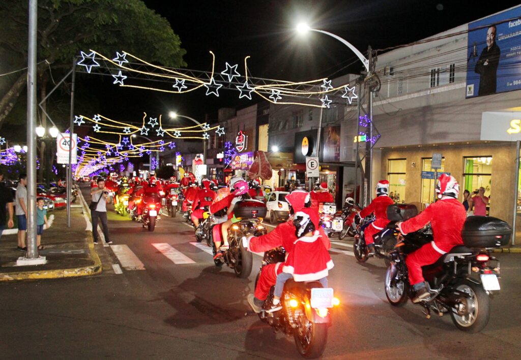 CLIMA DE NATAL 21/12/2022 às 12:34 Papais Noéis motociclistas roubam a cena na noite iluminada de Umuarama