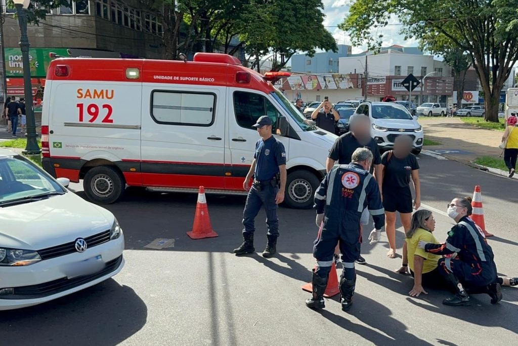 COLISÃO TRASEIRA 09/05/2025 às 15:48 Acidente entre carro e moto deixa mulher ferida na Praça Santos Dumont, em Umuarama
