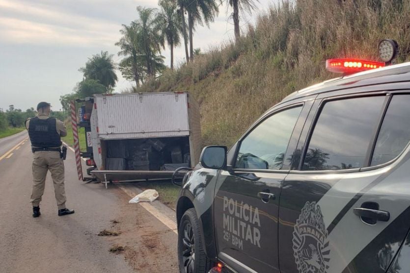 Caminhão carregado com cigarros é encontrado tombado em Umuarama; confira o vídeo