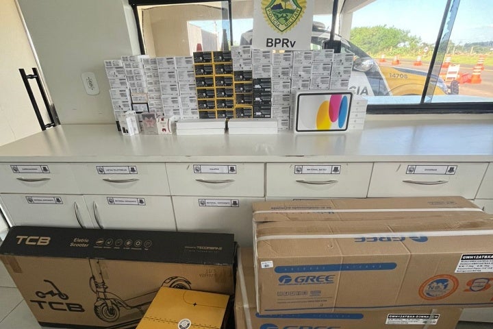 DESCAMINHO 18/02/2024 às 11:31 PRE apreende R$ 200 mil em celulares e eletrônicos na PR-323, em Perobal