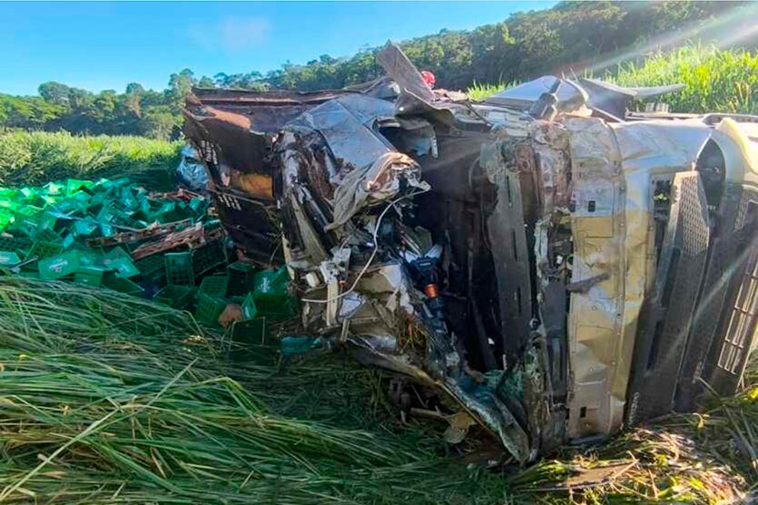 EM MURIAÉ 03/01/2025 às 07:50 Carreta carregada de cervejas tomba e atinge escolta de outro acidente na BR-116