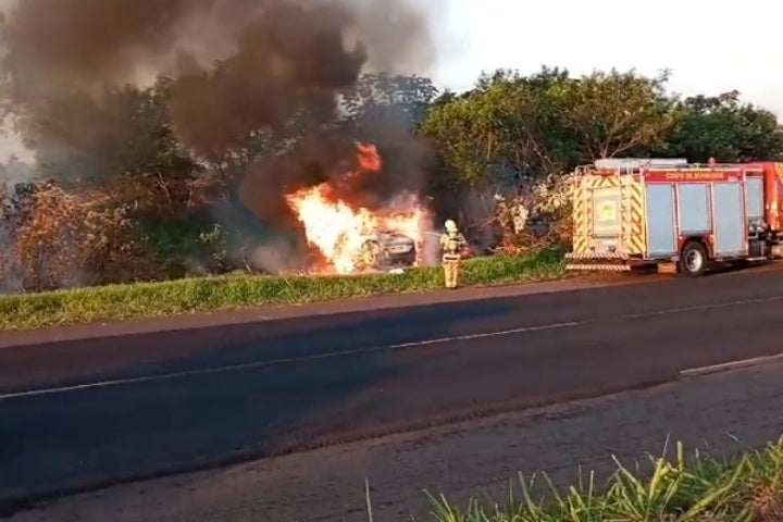 ENTRE UMUARAMA E CRUZEIRO 02/10/2023 às 10:52 Umuarama: Carro capota e pega fogo após condutor bater em árvore na PR-323