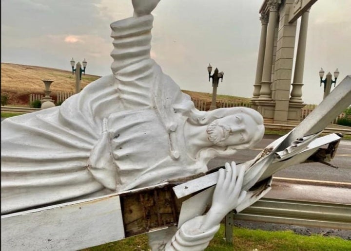FORÇA DO VENTO 08/10/2023 às 09:47 Vendaval derruba estátua de Cristo Redentor na entrada da cidade de Lunardelli