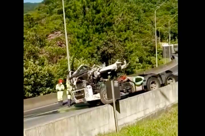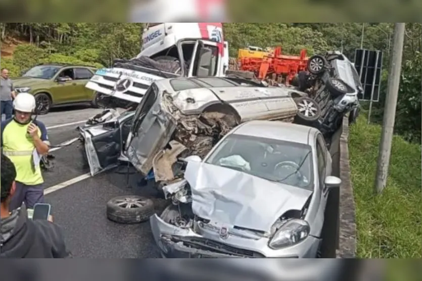 GUARATUBA 02/07/2023 às 18:35 Seis pessoas ficam feridas no engavetamento com caminhão e 15 carros no litoral do PR