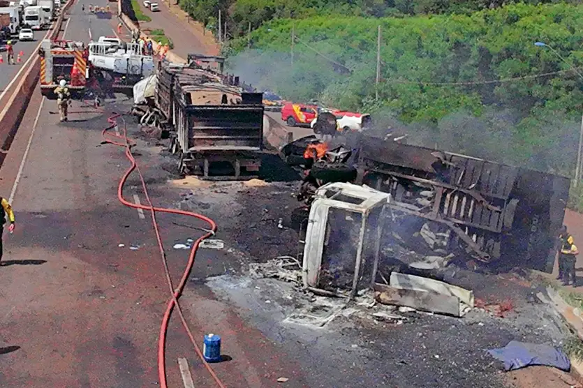 Colisão entre dois caminhões e uma carreta deixa 2 mortos em Maringá; veículos pegaram fogo