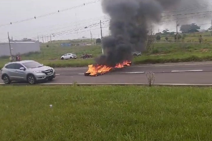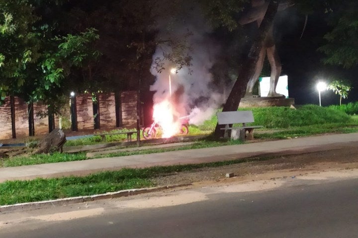 INCÊNDIO 29/04/2023 às 08:35 Motocicleta é destruída pelo fogo em frente ao Bosque dos Xetá, em Umuarama