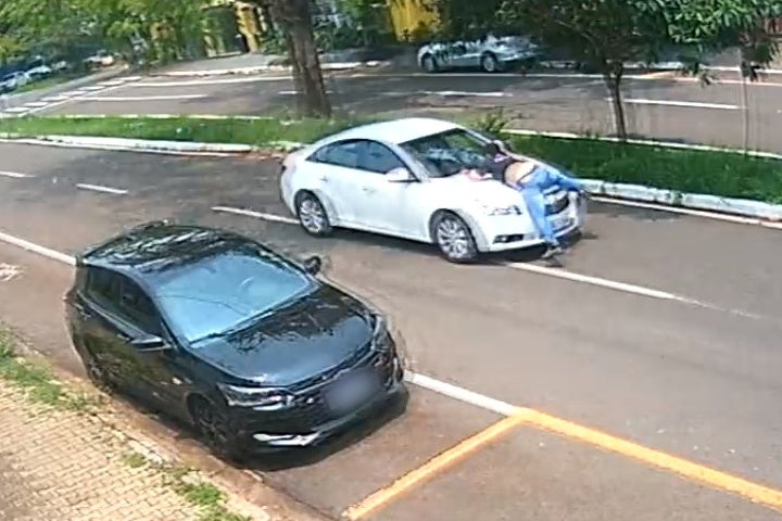 INUSITADO 26/10/2023 às 16:57 Homem é filmado sendo carregado em capô de automóvel no Centro de Umuarama