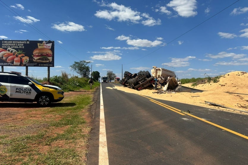 KM 476 23/10/2025 às 10:31 Caminhão carregado com ração tomba na PR-082 após condutor perder controle