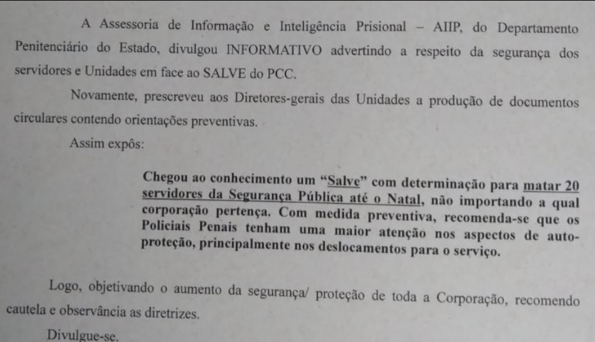 MINAS GERAIS 05/12/2021 às 08:19 PCC divulga ‘salve’ em que pede morte de servidores da segurança pública