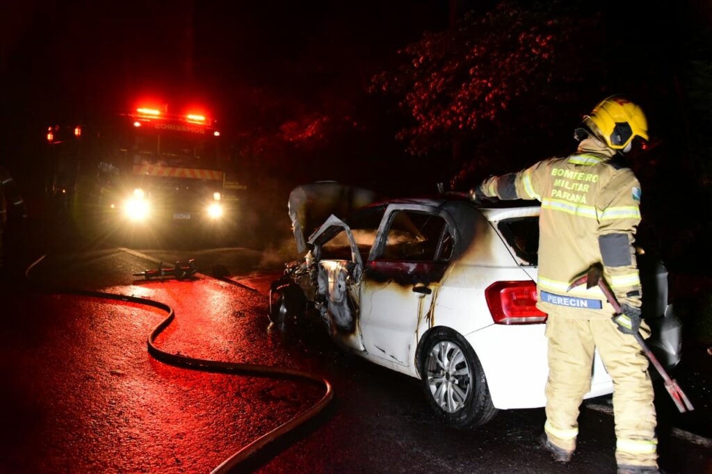 NOITE DESTA QUINTA 12/10/2023 às 22:16 Gol carregado de cigarros pega fogo ao bater em outros veículos na PR-323 em Umuarama
