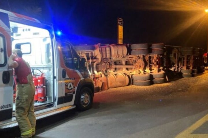 PR-317 29/08/2023 às 10:21 Caminhoneiro fica ferido após carreta com milho tombar no trevo de acesso a Goioerê