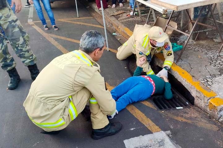PRAÇA SANTOS DUMONT 09/05/2022 às 17:44 Após atropelamento, mulher é arremessada e fica com a cabeça presa em bueiro no centro de Umuarama