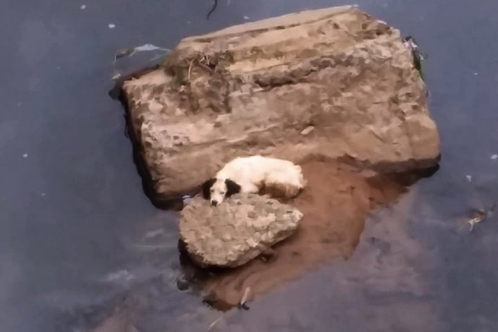 Umuarama: Cachorro é resgatado após ficar ‘ilhado’ em pedra no córrego Pinhalzinho
