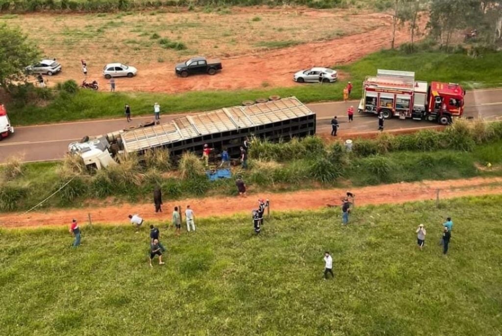 TOMBAMENTO 20/07/2024 às 15:02 Carreta carregada com esterco tomba na rodovia entre Ivaté e Serra dos Dourados