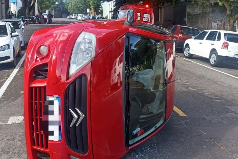 Trânsito 30/10/2025 às 20:02 Carro tomba após colisão e motorista sem CNH fica ferida no centro de Umuarama