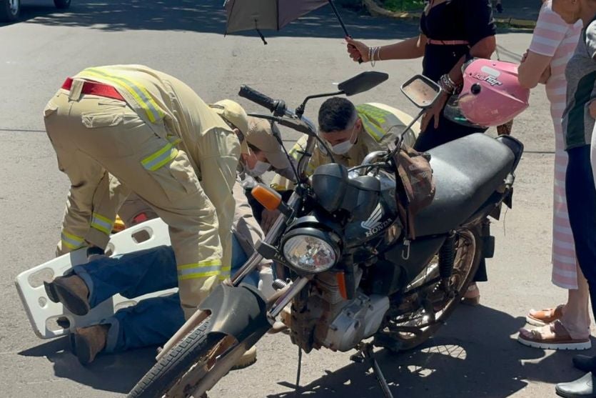 Motociclista é arremessada contra carro após colisão e é socorrida com suspeita de fratura