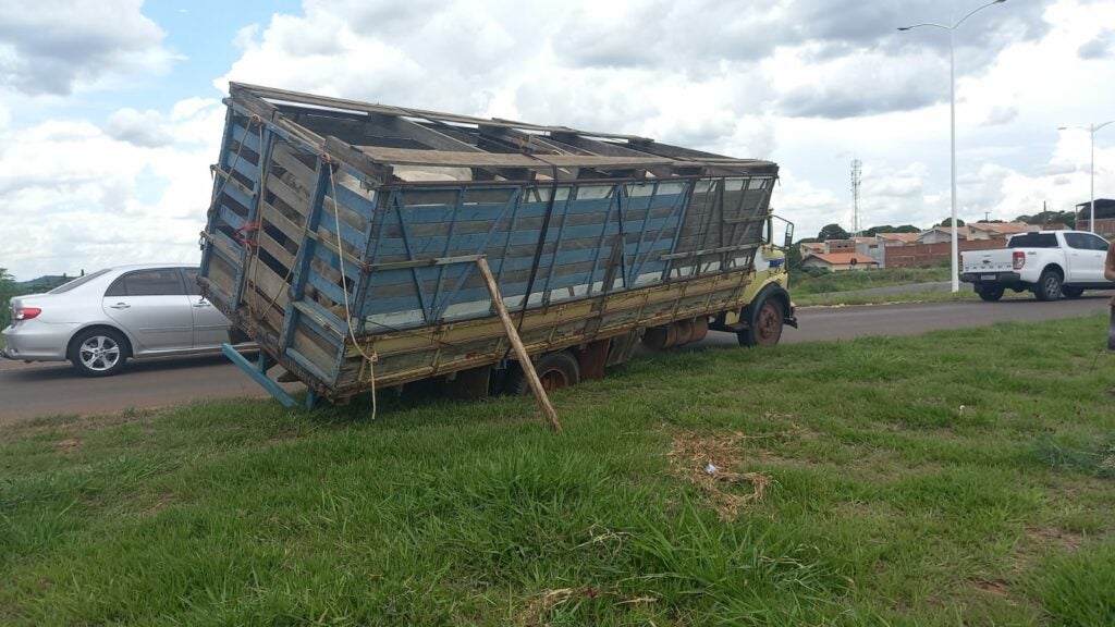 UMUARAMA 25/02/2022 às 15:20 Umuarama: Rodado de caminhão cai em buraco na margem PR-489 e veículo quase tomba